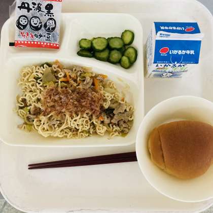 今日の献立は、黒糖パン、牛乳、和風やきそば、きゅうりのしょうがづけ、いり黒豆でした。