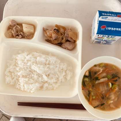 今日の献立は、ごはん、牛乳、鶏肉の甘辛焼き、みそ汁、だいこんの煮物でした。