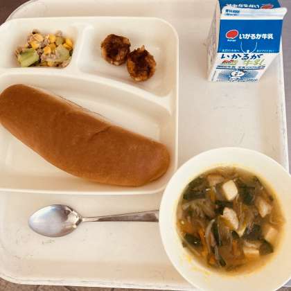 今日の献立は、黒糖パン、牛乳、揚げシューマイ、中華スープ、ツナとチンゲン菜の炒め物でした。