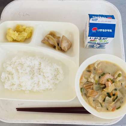 今日の献立は、ごはん、牛乳、鶏肉の甘辛焼き、かす汁、栗きんとんでした。