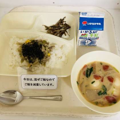 今日の献立は、牛乳、きんぴらちらし、雑煮、ごまめでした。