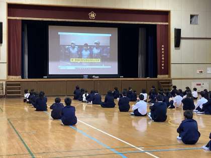 今日の児童朝会では給食委員会が作成したビデオをみて、給食を作ってくださる調理員さんに感謝することや、残さず食べてじょうぶな体を作ることの大切さについてみんなで考えました。