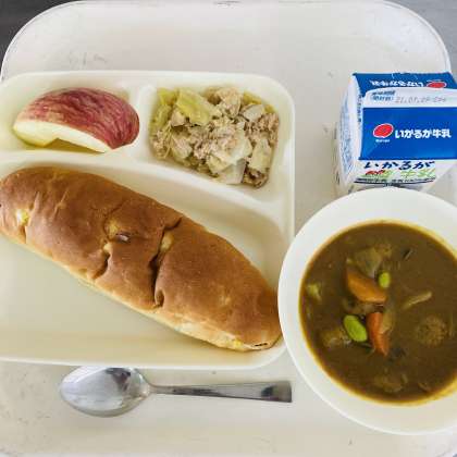 今日の献立は、おさつパン、牛乳、ミートボールと野菜のカレー煮、ツナとキャベツのソテー、りんごでした。