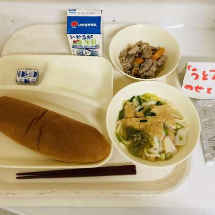 今日の献立は、黒糖パン、牛乳、豚肉とごぼうの煮物、なにわうどん、固形チーズでした。