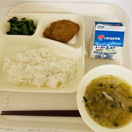 今日の献立は、ごはん、牛乳、たらフライ、すまし汁、小松菜のごまあえでした。