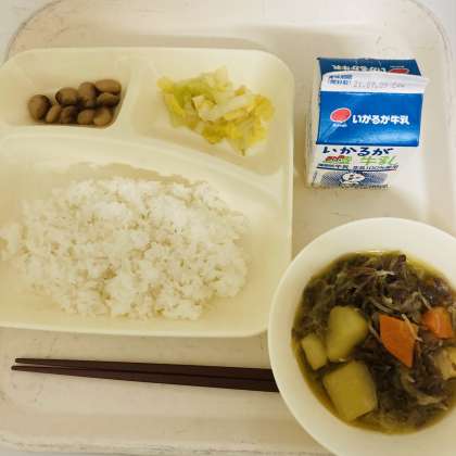 今日の献立は、ごはん、牛乳、肉じゃが、白菜のゆず風味、とら豆の煮ものでした。