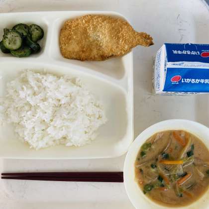 今日の献立は、ごはん、牛乳、いわしフライ、みそ汁、きゅうりの赤じそあえでした。