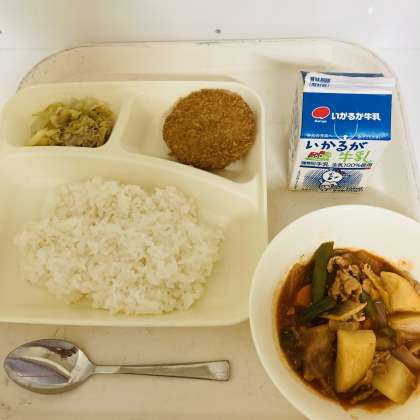 今日の献立は、ごはん、牛乳、チキンレバーカツ、ケチャップ煮、ツナとキャベツのバジルソテーでした。