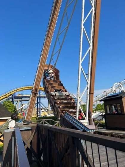 天気は晴れです。一面青空です。子どもたちはスイングサンタマリアに乗っています。本当に楽しそうです。