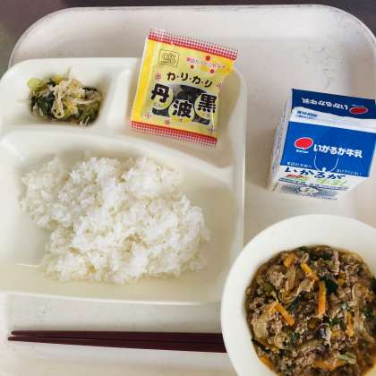 今日の給食は、ご飯、牛乳、マーボーはるさめ、チンゲンサイともやしの甘酢あえ、いり黒豆でした。