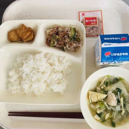 今日の献立は、ご飯、牛乳、ゴーヤチャンプルー、五目汁、あつあげのしょうがじょうゆかけでした。