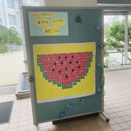 6月19日からスタートした「はやね・朝ごはんチャレンジ」の絵が完成しました。夏が旬のスイカです。子どもたちも途中からは「これぜったいスイカやで!」と言いながら毎日シールを貼っていました。