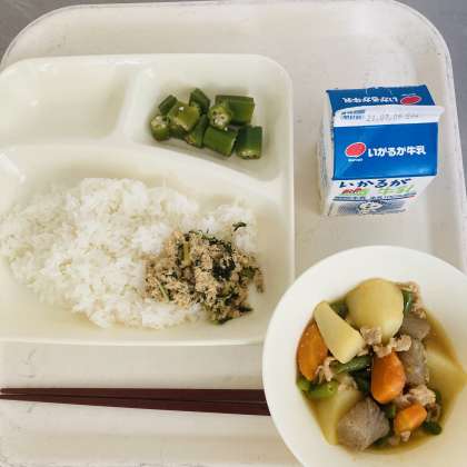 今日の献立は、ご飯、牛乳、豚肉とじゃがいもの煮物、オクラの梅風味、ツナっ葉いためでした。