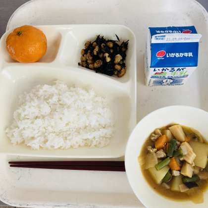 今日の献立は、ご飯、牛乳、鶏肉と野菜の煮物、ひじき豆、冷凍みかんでした。