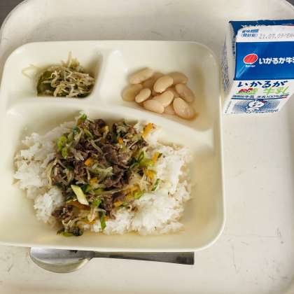 今日の献立は、牛乳、牛丼、もやしとピーマンのごまいため、大福豆の煮ものでした。