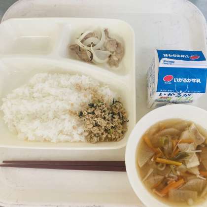 今日の献立は、ご飯、牛乳、鶏肉のゆず塩焼き、ソーキ汁、ツナ大豆そぼろでした。