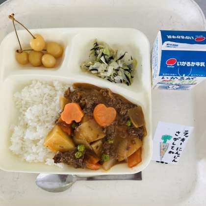 米粉のハヤシライスは、小麦粉を油脂でいためて作ったルウの代わりに水で溶いた上新粉でとろみをつけています。ラッキーにんじんの形は、給食調理員さんが毎回選んでくださっています。今日は、ハートと車の2種類でした。