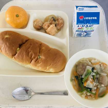 今日の献立は、おさつパン、牛乳、さけのマリネ、肉だんごと麦のスープ、みかんでした。