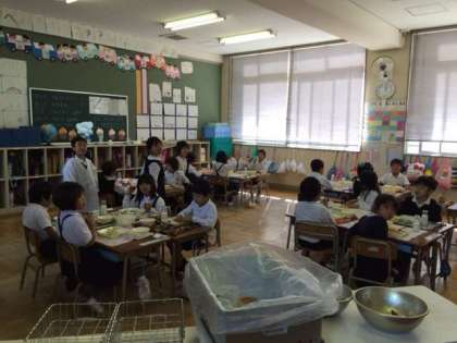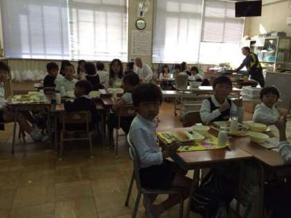 今日のメニューは、レーズンパン、牛肉のカレー風味焼き、トマトのスープスパゲティにキャベツとキュウリのピクルスです。