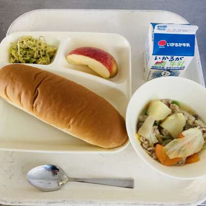 今日の献立は、黒糖パン、牛乳、豚肉と野菜のスープ煮、カレーソテー、りんごでした。