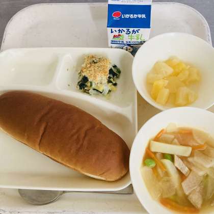 今日の献立は、黒糖パン、牛乳、ほたて貝のグラタン、スープ、パインアップル(カット缶)でした。