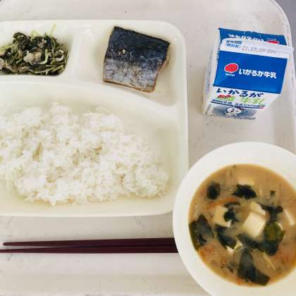 今日の献立は、ご飯、牛乳、さごしのしょうゆだれかけ、とうふのみそ汁、みずなの煮びたしでした。