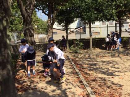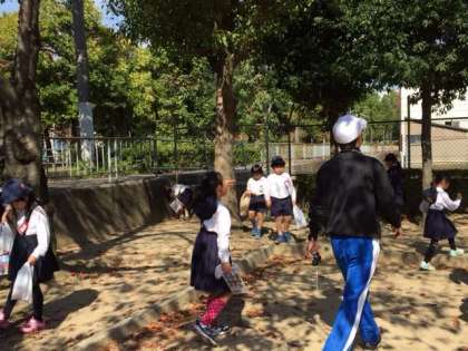 秋晴れの3時間目、1年生が学校前の公園で、「秋見つけ」の勉強をしています。お友だちと黄色く紅葉した桜の葉やドングリを拾っています。「先生、教科書といっしょや!」見慣れているはずの秋の風景の一つ一つが、子どもたちの目には新鮮に映るようです。
