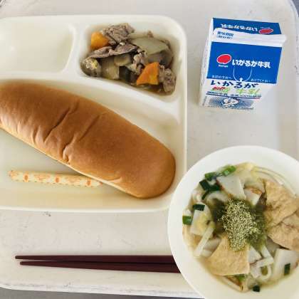 今日の献立は、黒糖パン、牛乳、豚肉とごぼうの煮物、なにわうどん、棒チーズでした。