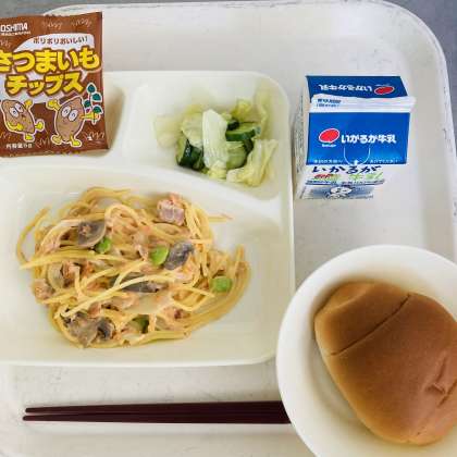 今日の献立は、黒糖パン、牛乳、さけのクリームスパゲッティ、キャベツときゅうりのサラダ、おさつチップスでした。