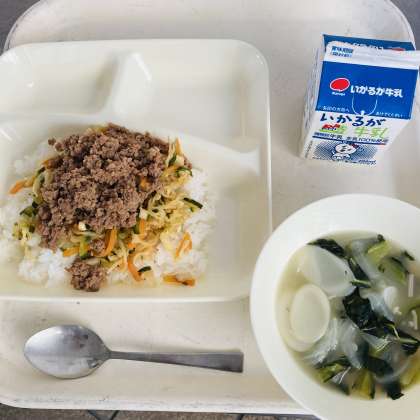 ビビンバは、子どもたちに人気があるメニューです。甘辛く味付けしたひき肉、野菜のナムルをご飯に混ぜて食べます。にんにくやごま油、コチジャンの風味がきいています。ナムルには、切り干し大根、きゅうり、にんじんを使用し、いろどりと歯ごたえが楽しめるようになっています。