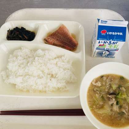 今日の献立は、ごはん、牛乳、赤魚のしょうゆだれかけ、豚汁、ひじきのいため煮でした。
