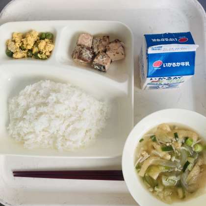 今日の献立は、ごはん、牛乳、さけのごまみそ焼き、五目汁、えんどうの卵とじでした。