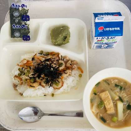 今日の献立は、牛乳、かやくご飯、みそ汁、抹茶ういろうでした。