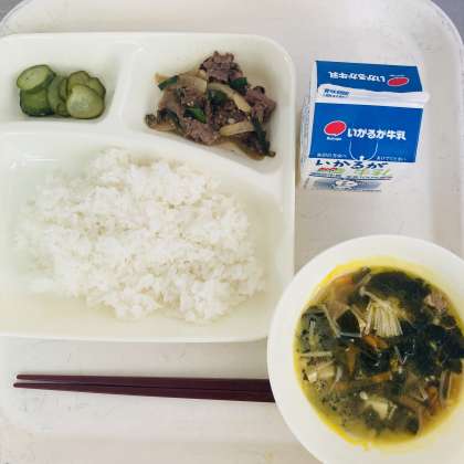 今日の献立は、ごはん、牛乳、プルコギ、豆腐とわかめのスープ、きゅうりの甘酢づけでした。
