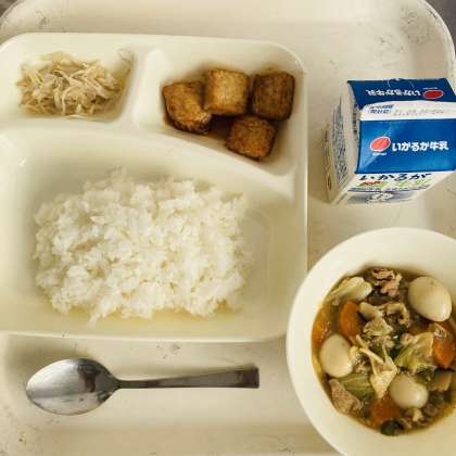 今日の献立は、ごはん、牛乳、八宝菜、厚揚げのピリ辛じょうゆかけ、もやしの中華あえでした。