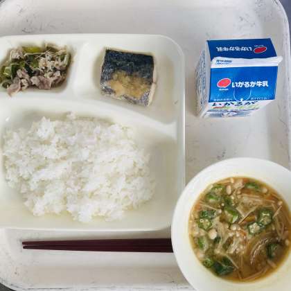 今日の献立は、ご飯、牛乳、さごしのおろしじょうゆかけ、みそ汁、野菜いためでした。