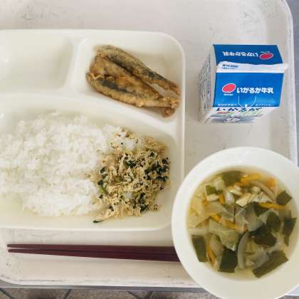 今日の献立は、ご飯、牛乳、いわし天ぷら、五目汁、とりなっ葉いためでした。