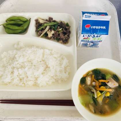 今日の献立は、ご飯、牛乳、チンジャオニューロウスー、中華みそスープ、枝豆でした。