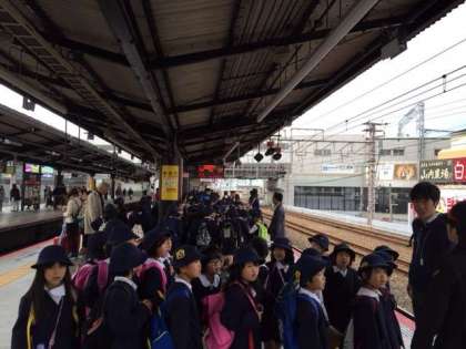 今日は全校児童160人で、新大阪のメルパルクホールに向かっています。みんな、しっかりマナーを守って電車に乗っています。