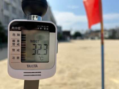 朝から良い天気で、セミの声が大きく響いています。運動場の熱中症指数は32.3℃の「きけん」です。これからも暑い日が続くと思いますが、熱中症にならないように十分気をつけて過ごしましょう。