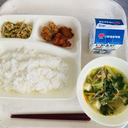 今日の献立は、ご飯、牛乳、ヤンニョムチキン、豆腐のスープ、切り干し大根のナムルでした。