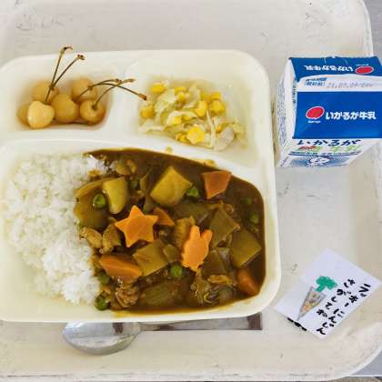 今日の献立は、牛乳、チキンカレーライス、キャベツとコーンのサラダ、さくさんぼ(缶)でした。