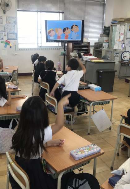 水曜日の朝学習は英語です。動画でお話を見たり、歌を聞いたりします。子どもたちはとても楽しみにしていて、聞こえてくるフレーズを真似して言ったり、歌を一緒に歌ったり、楽しく活動しています。