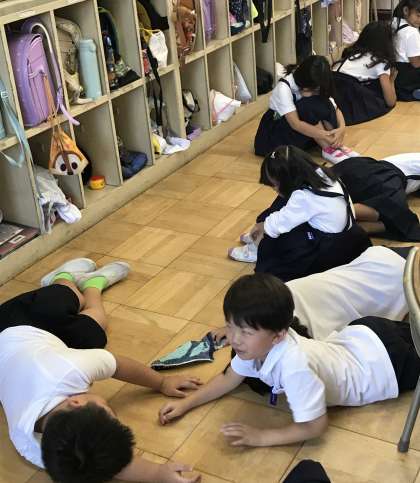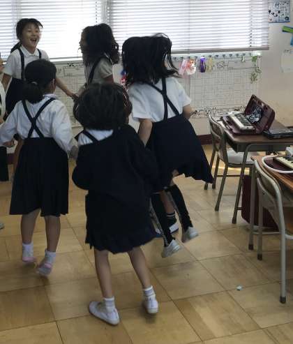 今子どもたちは「みつばちハニーのぼうけん」という曲が大のお気に入りで、いつも「今日は1回だけね」と言っても「もう1回!もう1回!」とコールが起きるほどです(笑)みつばちハニーがお花を探しに出かける中で、疲れて元気をなくしたり、お花を見つけて喜んだりする様子を表現した曲ですが、子どもたちは曲調の変化に合わせて、ハニーになりきって全身で表現活動を楽しんでいます。