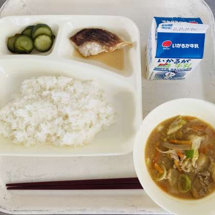 今日の献立は、ご飯、牛乳、赤魚のしょうゆだれかけ、豚汁、きゅうりのゆず風味でした。