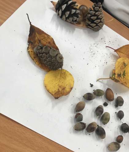 緑陰道路に秋見つけに行きました。どんぐりや松ぼっくり、きれいな色の葉っぱもたくさん見つけました。帰ってきてから、見つけたものを組み合わせて遊びました。組み合わせを工夫して動物や虫などいろいろなものを作っていていました。できたものを写真に撮って、国語科の「なにに見えるかな」とつなげて学習したり、工作をしたりしていきます。