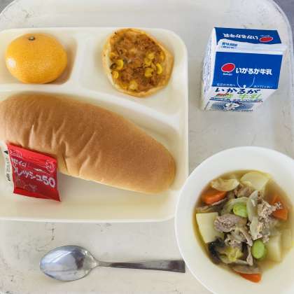 今日の献立は、コッペパン、牛乳、豚肉と野菜のスープ煮、変わりピザ、みかん、いちごジャムでした。