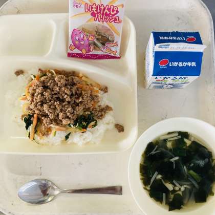 今日の献立は、牛乳、ビビンバ、わかめスープ、いもけんぴフィッシュでした。