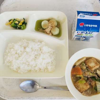 今日の献立は、ご飯、牛乳、ジャージャン豆腐、チンゲンサイのオイスターソースあえ、抹茶白玉のきな粉がけでした。