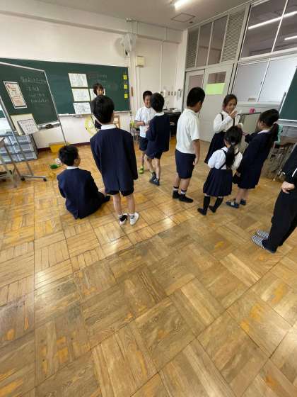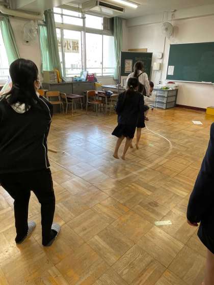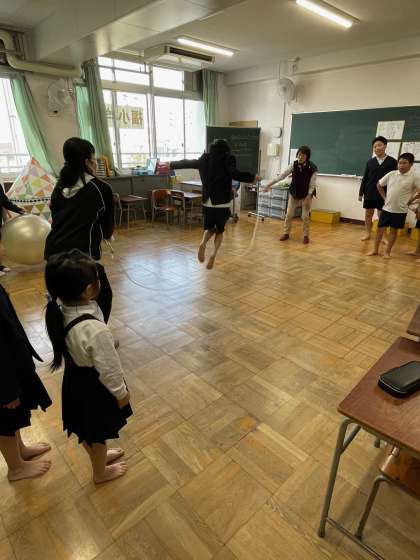 今日は、ならびっこゲームと長縄をしました。喋らずジェスチャーだけで誕生日順に並びました。長縄は、八の字や通り抜け、何人かで一列になって跳ぶということをしました。